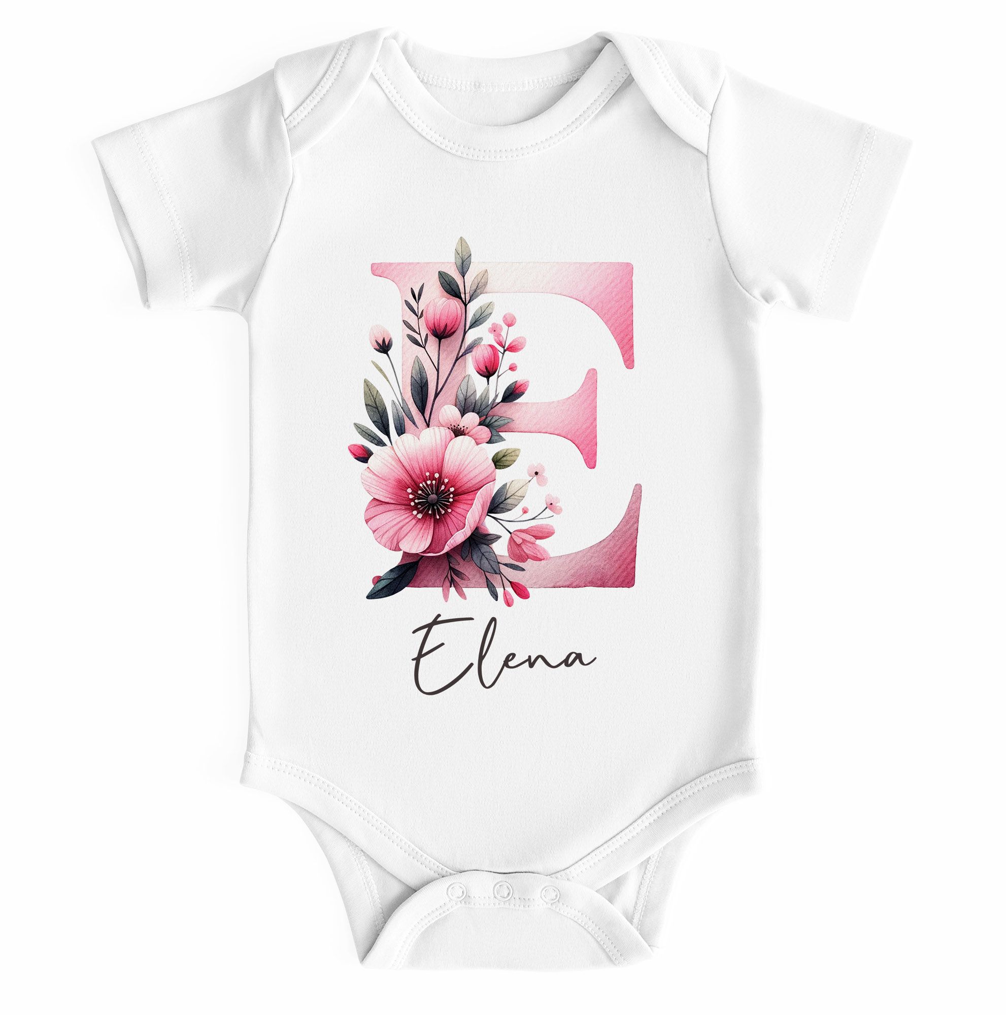 • Gestalte das Baby Outfit zu etwas Besonderem! Mit diesem süßen Babybody für Mädchen mit edler floraler Illustration, großem Initial und personalisiertem Namensschriftzug – stilvoll, modern und liebevoll entworfen und hochwertig bedruckt