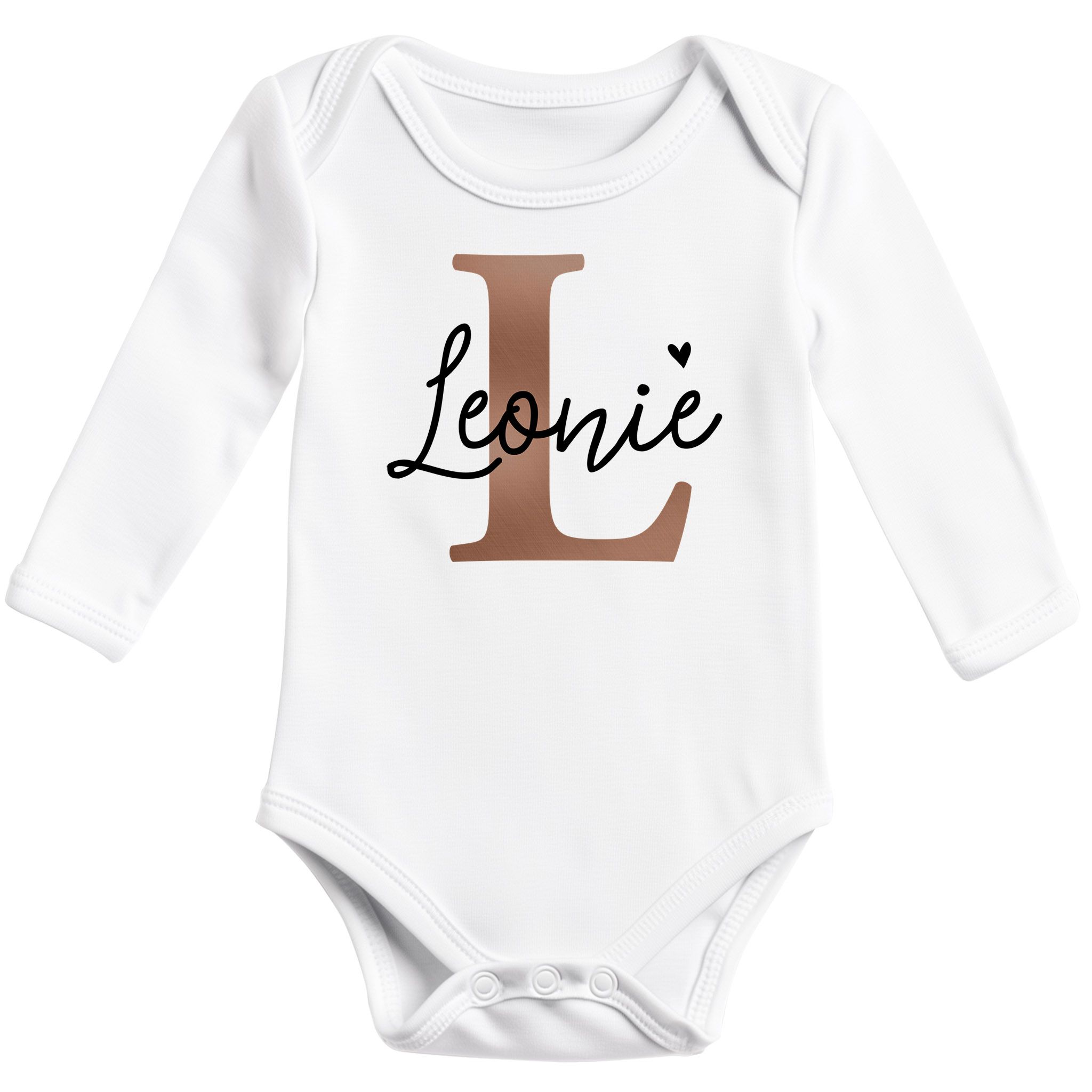 • Niedlicher personalisierbarer Langarmbody mit Name und Anfangsbuchstabe in Kupferoptik, verziert mit einem kleinen Herz. Ein süßes und individuelles Geschenk zur Geburt, zum Geburtstag oder zu Weihnachten