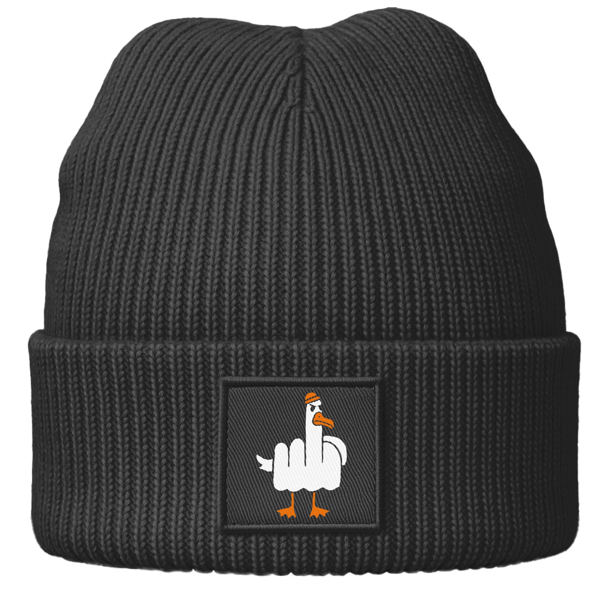 Die Strickmütze für Herren sitzt bequem, hält Kopf und Ohren warm und setzt mit ihrem frechen Patch ein Statement. Ideal für alle, die funktionale Herren-Klamotten mit einer Portion Humor kombinieren möchten.
