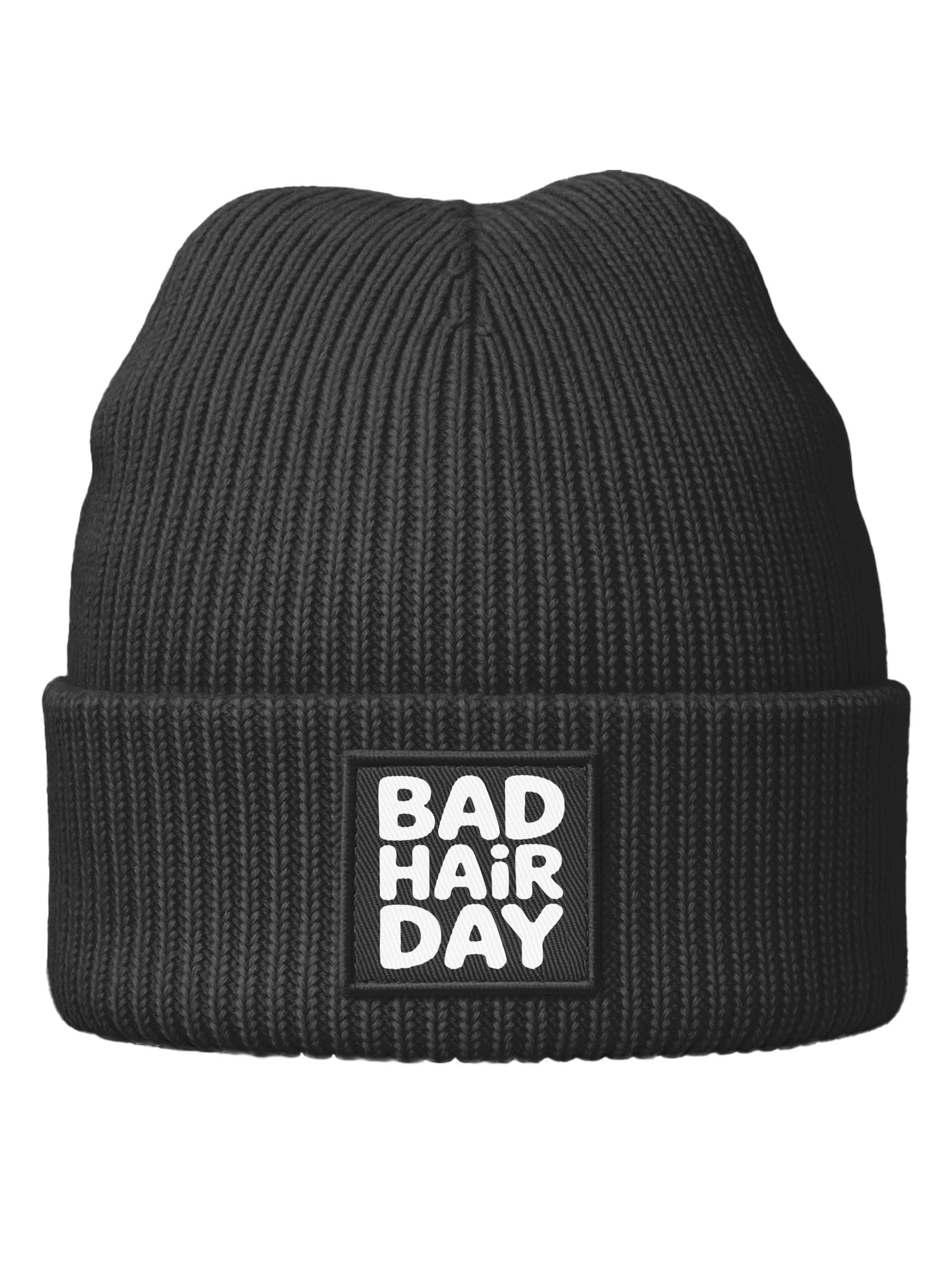 Herren Beanie Patch Bad Hair Day Spruch Aufdruck Wintermütze Streetwear Männer Moonworks®