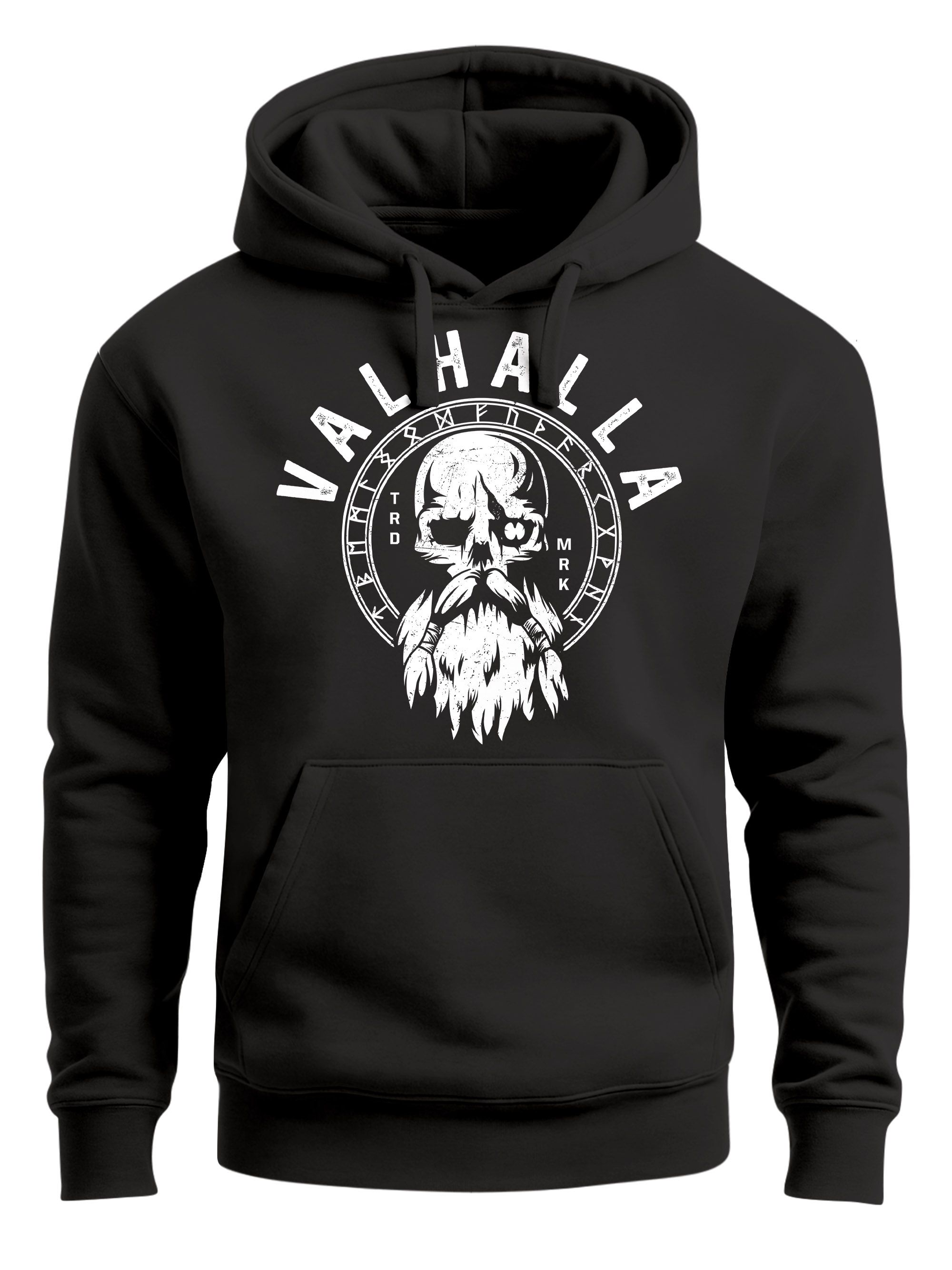 - Lässiges Kapuzenoberteil für Männer mit Valhalla Aufschrift und dem Göttervater Odin in Form eines bärtigen Wikinger-Skull und Runen-Verzierung