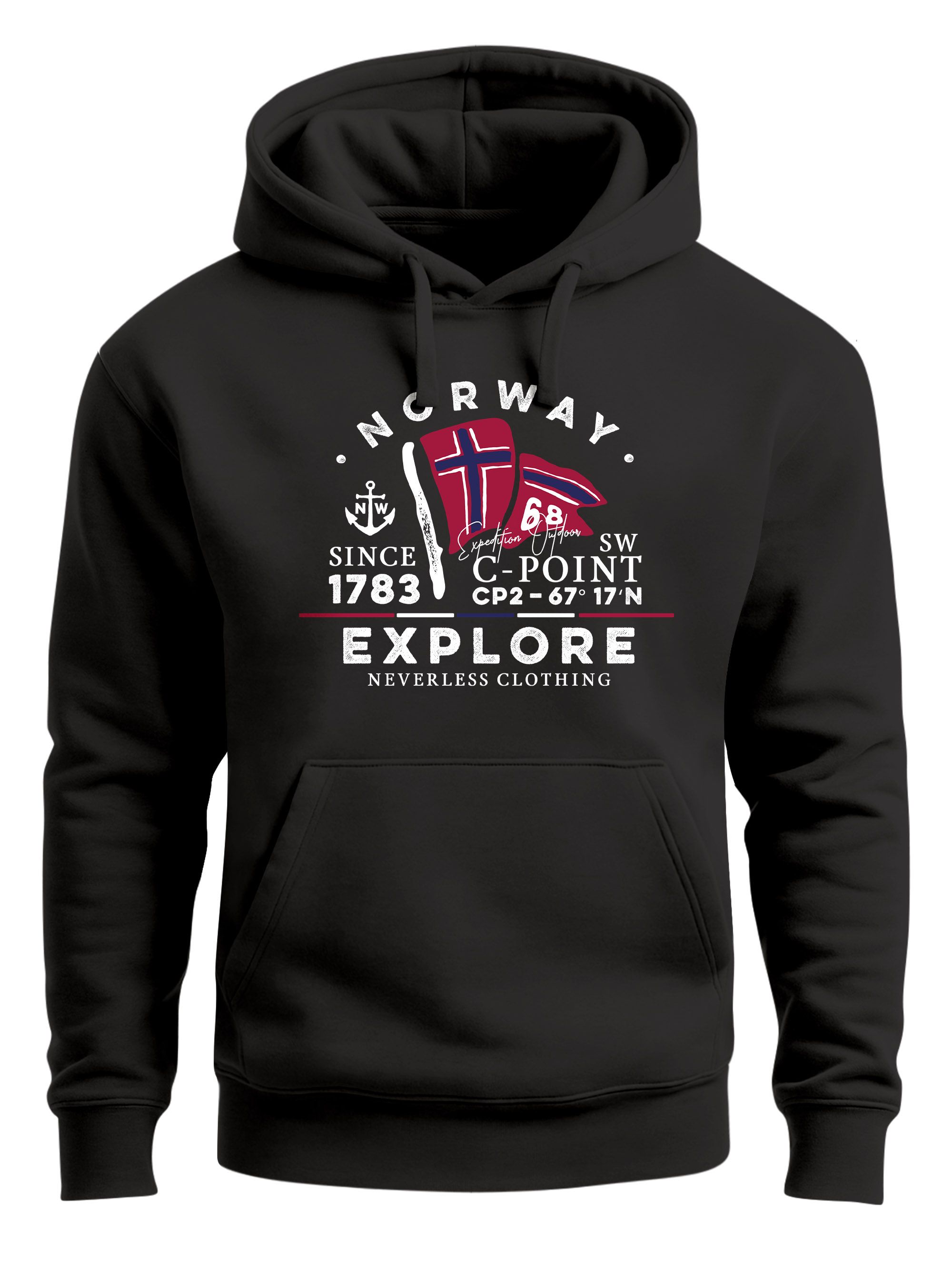 - Key-Piece für kühle Tage der Marke Neverless® Lässiger Hoodie für Herren mit Schriftzug "Norway Explore" und norwegischem Flaggensymbol und Koordinaten. Ein trendiger Kapuzenpullover für alle Nordlichter und Norwegen-Fans
