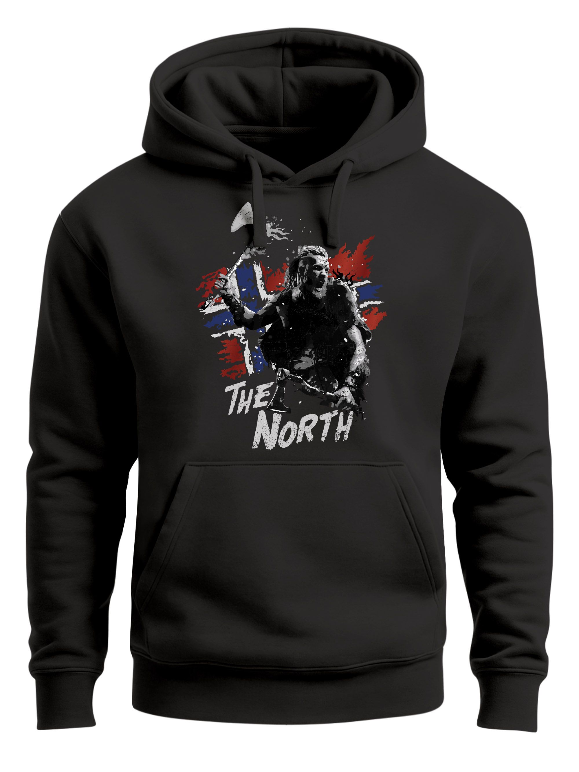 - Motiv: Schriftzug "The North" mit Wikinger Illustration, Streitaxt, Krieger, Norwegen-Flagge, Fahne
