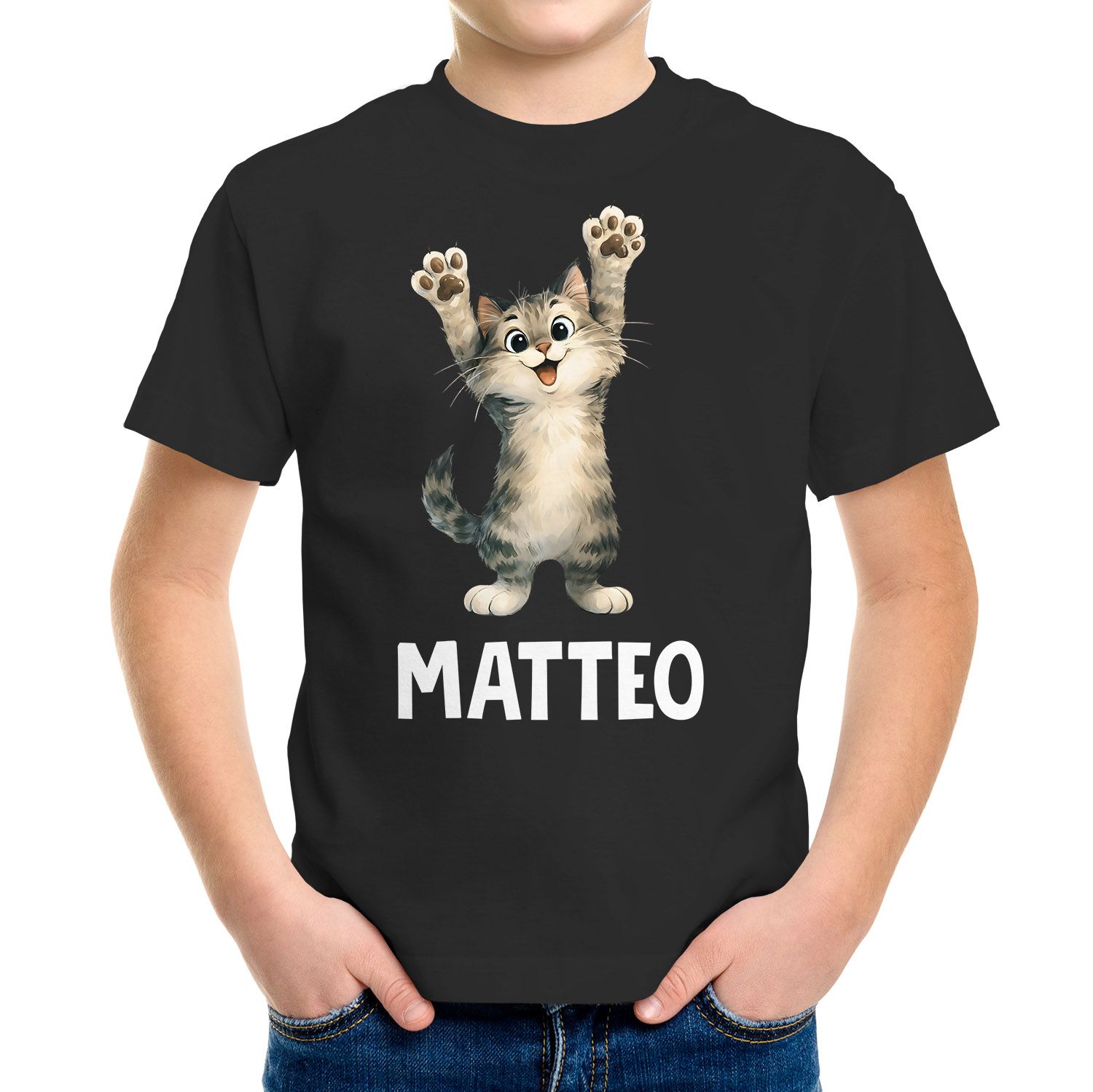 Kinder T-Shirt Katze mit Name – personalisiertes Shirt für Jungen – Lustiges Katzenmotiv– Geschenk zum Geburtstag oder Schule Moonworks®