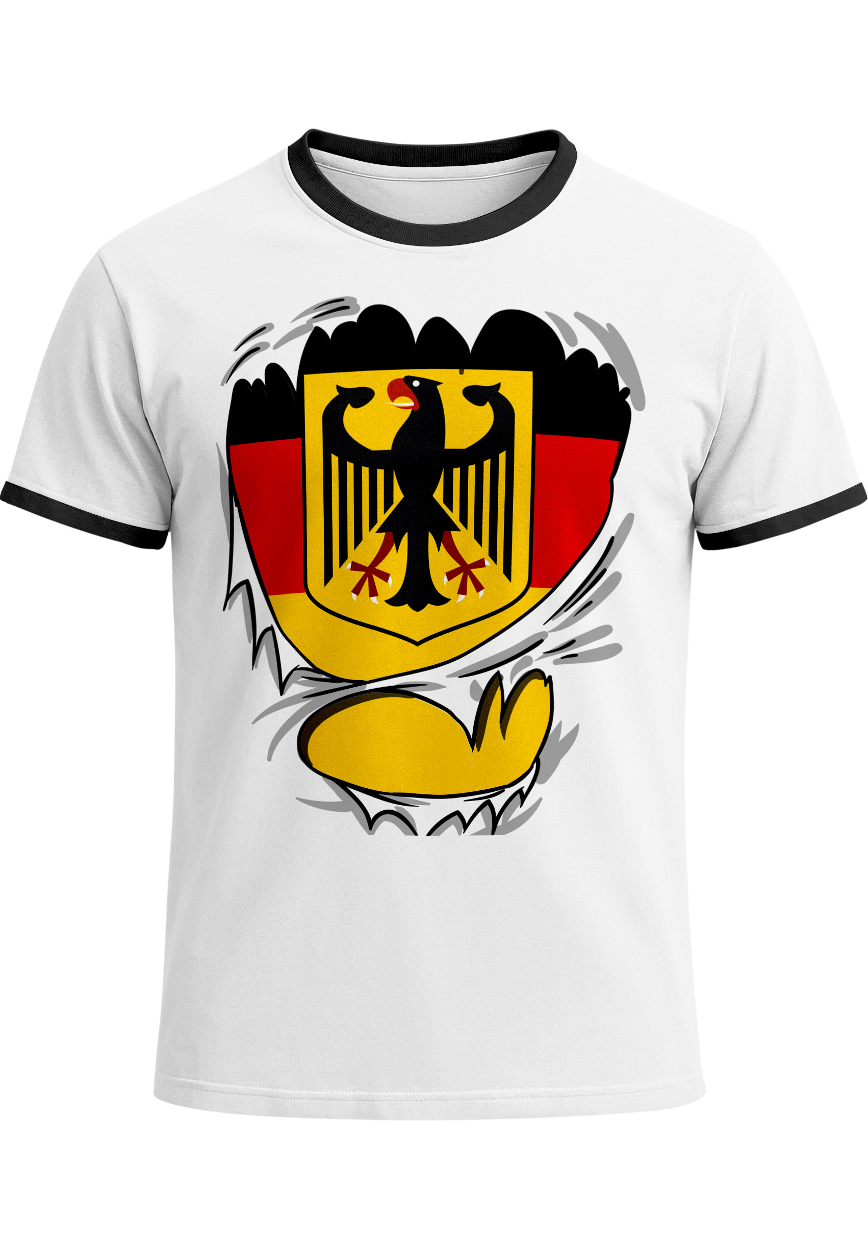 • lustiges Herren T-Shirt zur Fußball WM 2026 mit zerissenem Superheld T-Shirt Look und darunterliegender Deutschland Flagge