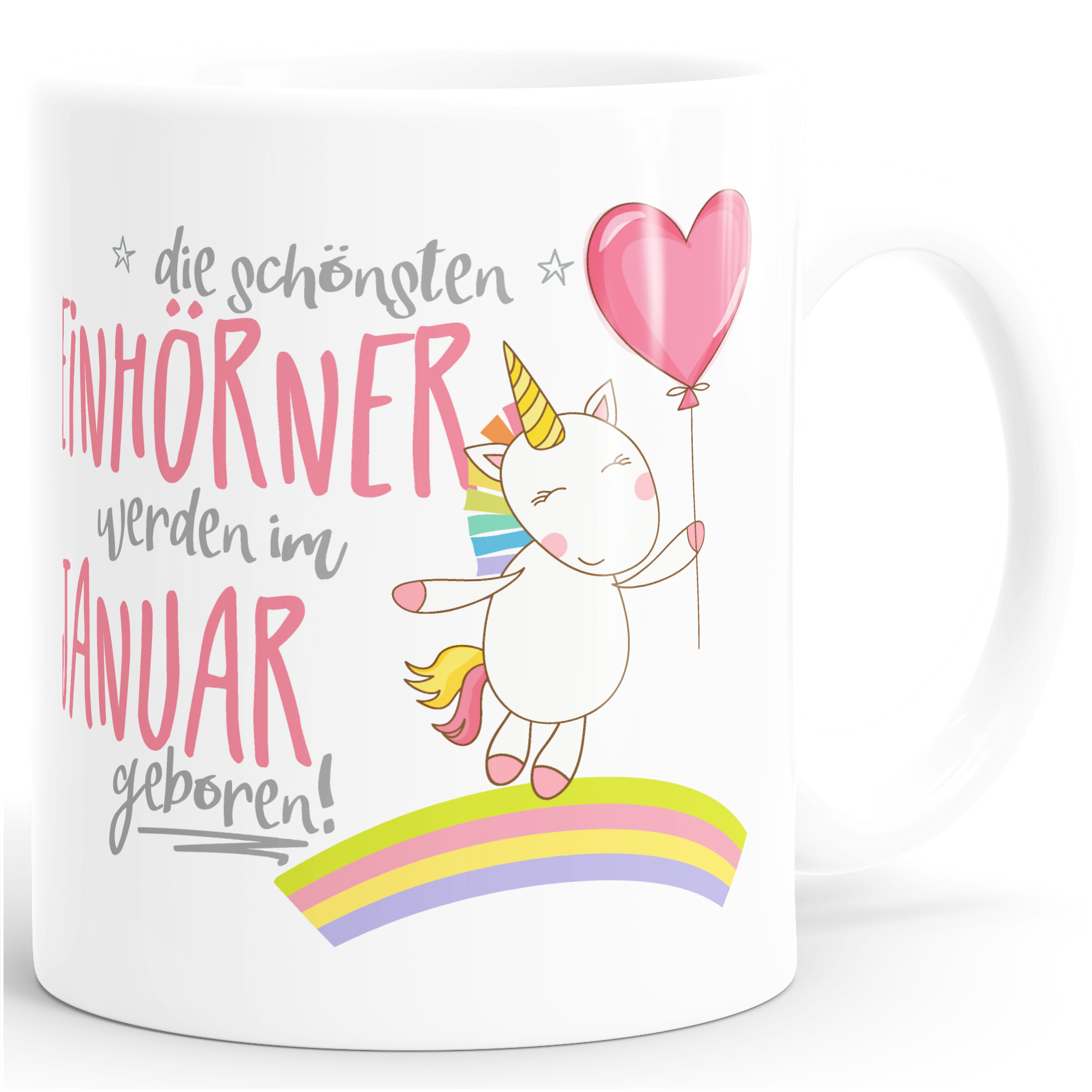 Einfach zauberhaft süß und unglaublich liebevoll präsentiert sich diese unvergleichliche Einhorn-Tasse aus der Kreativschmiede Moonworks®. "Die schönsten Einhörner werden im Januar geboren!" ist das ideale Geschenk für Geburtstagskinder im Januar. Mit dem zauberhaften Einhorn, das mit seinem liebevollen Herz-Ballon freudig über einen farbenprächtigen Regenbogen hüpft überbringt diese Tasse liebevolle Geburtstagsgrüße und sorgt zweifelsohne für freudige Begeisterung.