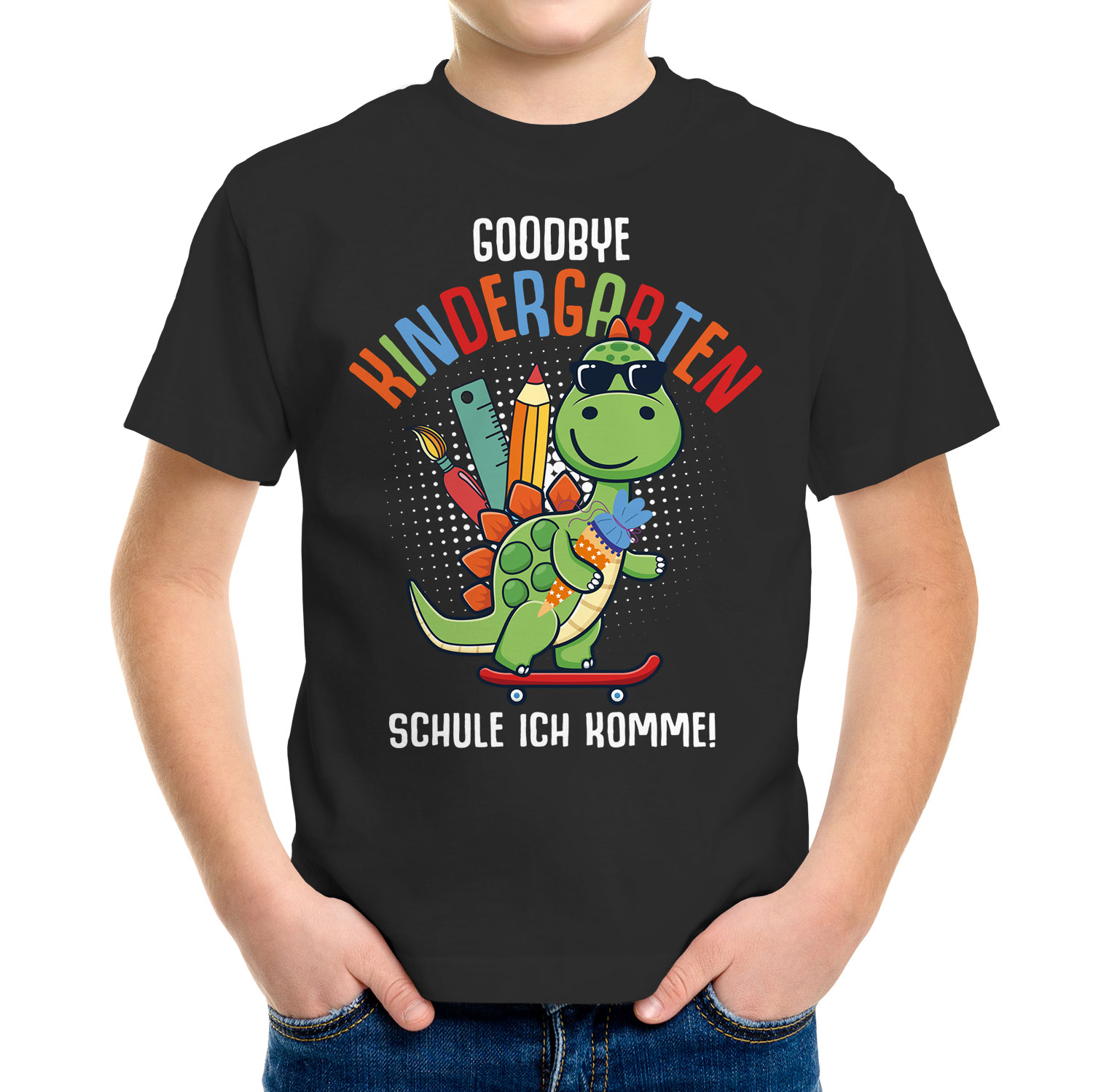 - Lustiges Einschulungs-Shirt für kleine Jungs und Mädels. Das Motiv mit coolem Dino auf Skateboard und Spruch "Goodbye Kindergarten - Schule ich komme" ist das perfekte Outfit für den ersten Schultag