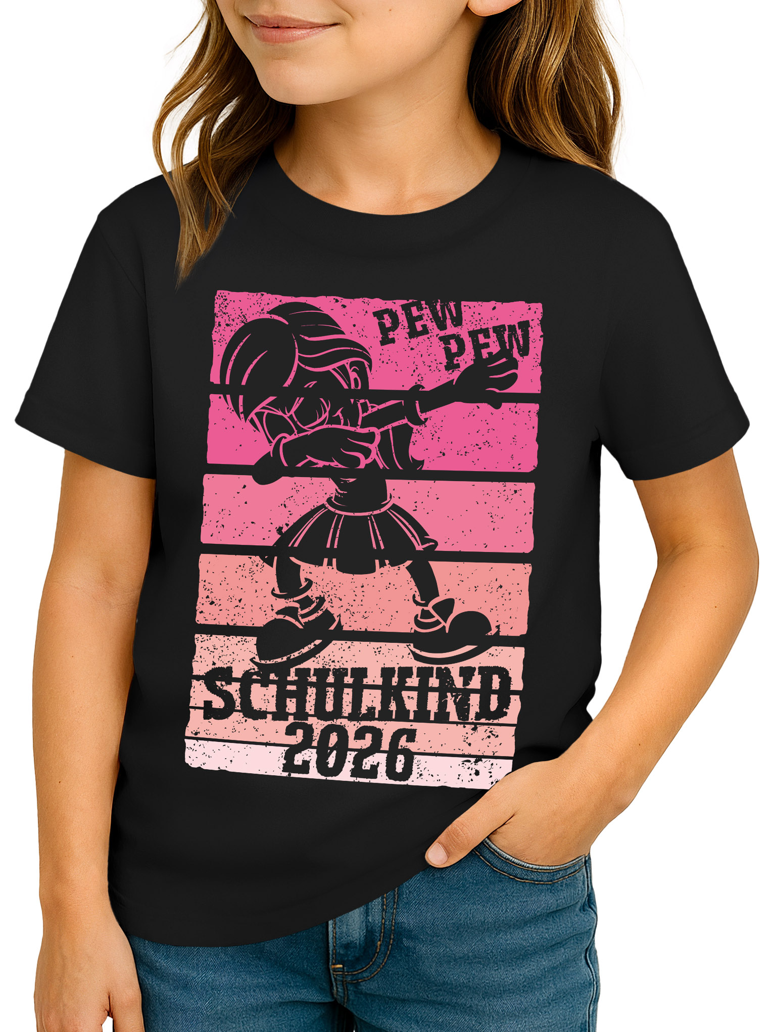 - Motiv: Schriftzug "Schulkind + anpassbare Jahreszahk", dabbendes Schulkind im Comic-Stil