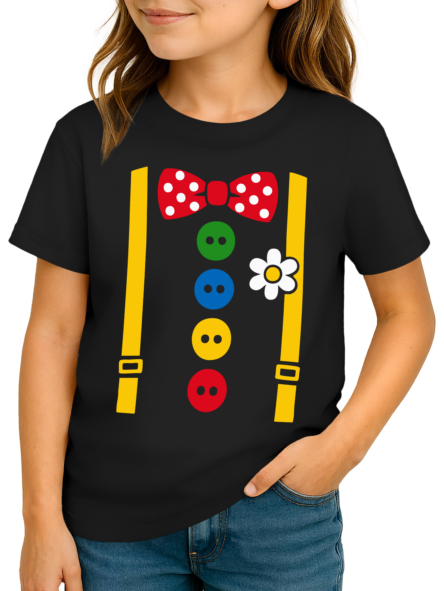 • Faschings-Shirt für Mädchen im Clown-Outfit-Look mit Fliege, Knöpfen und Hosenträgern – einfache Kostüm-Alternative für Karneval, Schulfeiern und Kinderpartys. Mit passenden Accessoires ist das Shirt auch als Oberteil eines niedlichen DIY-Kostüm eine kreative Idee für einfache Verkleidung