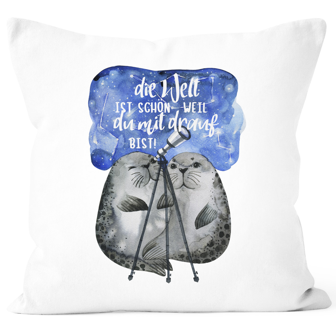 - wunderschönes Liebes-Geschenk zu Weihnachten oder Valentinstag: Kissenbezug mit "Die Welt ist schön weil du mit drauf bist" Liebes-Spruch und süßem, verliebten Robben Pärchen, das verliebt den Sternenhimmel betracht - handgezeichnet im Watercolor Stil der Marke Moonworks®. Einfach ein kleinder Liebesbeweis für einen besonderen Menschen...