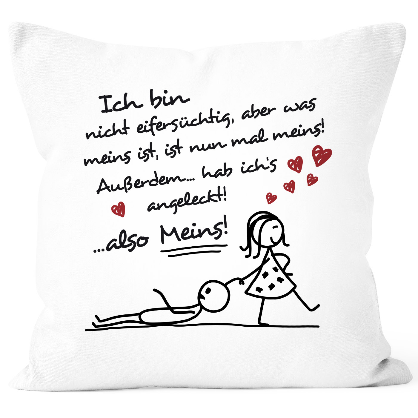 - Süße Kissenhülle mit Strichmännchen -Pärchen und lustigem Spruch: "Ich bin nicht eifersüchtig, aber was meins ist, ist nun mal meins! Außerdem hab ichs angeleckt!...also Meins!" Wahlweise angepasst für Männlein oder Weiblein ;-)