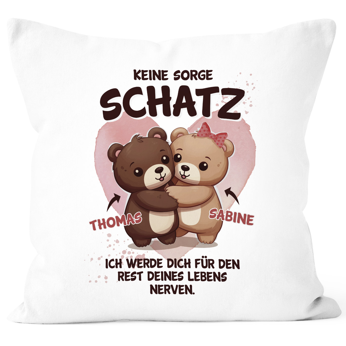- "Schatz, ich werde dich für den Rest deines Lebens nerven". Die Kissenhülle mit lustigem Liebes-Spruch und niedlichem Bären-Motiv kannst du unter "Jetzt anpassen" mit deinen Wunschnamen personalisieren