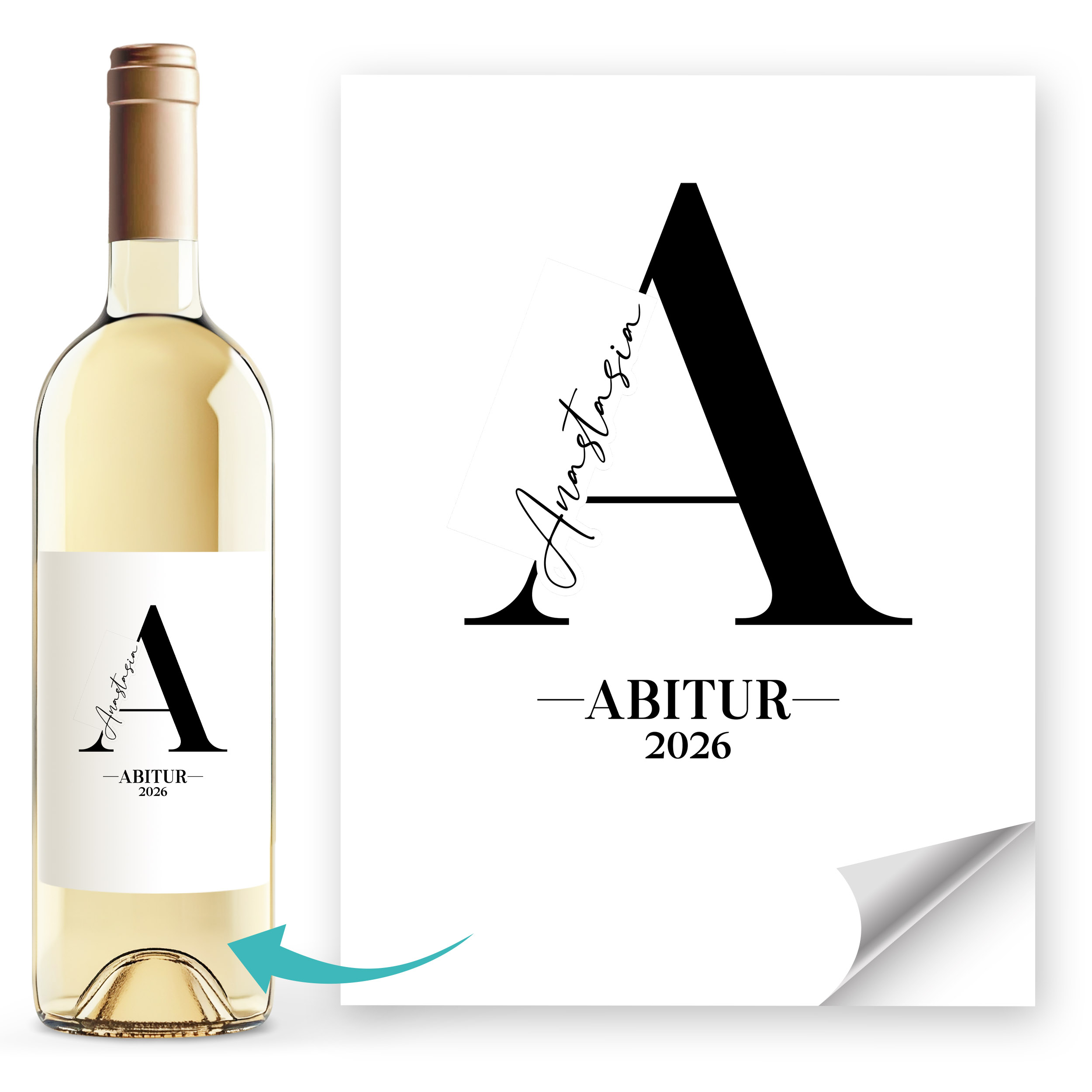 • Elegantes Monogramm-Design mit großem Initialbuchstaben, individuellem Wunschname und Abschlussjahr. Die minimalistische Gestaltung wirkt zeitlos und stilvoll und macht aus jeder Weinflasche eine persönliche Erinnerung an einen besonderen Meilenstein